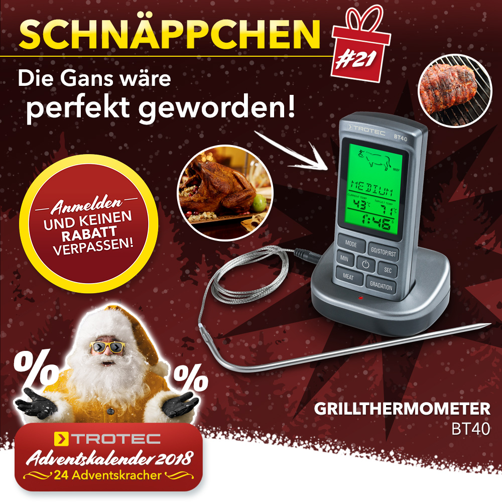 Leider verpasst! Die kabellose Temperaturkontrolle beim Grillen, Braten und Backen – das Grillthermometer BT40. Und genau das gab es in unserem heutigen Adventskalender zum Angebotspreis.
