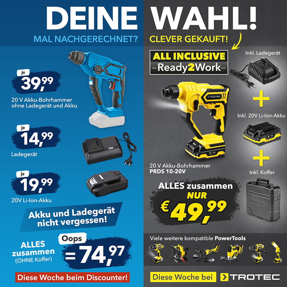Verlockende Angebote gibt es viele, aber Moment, haben Sie wirklich genau verglichen oder sich nur vom Preis auf den ersten Blick blenden lassen? Beim Discounter um die Ecke gibt es diese Woche Elektrowerkzeuge zu einem interessanten Preis, das haben wir uns einmal näher angeschaut und mit unseren „Ready2Work“ Komplettsets verglichen.