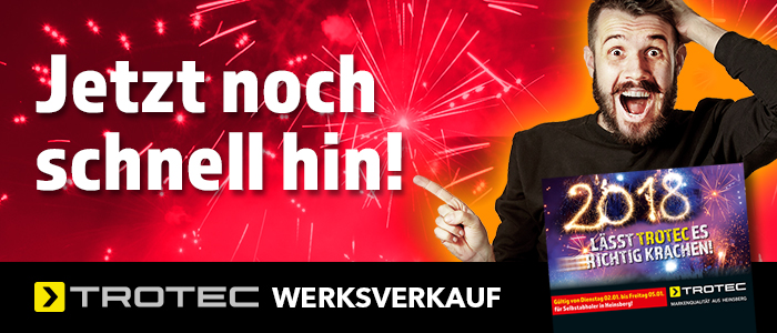 Die ganze Woche über gab es schon tolle Angebote aus unserer Zeitungsbeilage in der SuperSonntag. Wer bis Freitag, 5.1. schnell noch ein paar Schnäppchen ergattern will, sollte von 8 bis 17 Uhr beim Trotec Werksverkauf hereinschauen.