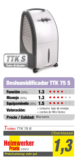 La revista alemana “Heimwerker Praxis” también elogia el cambio de filtro simple y asigna la calificación de «muy buena» para la relación calidad-precio del equipo y una puntuación global de 1,3. Estamos muy satisfechos con el resultado de nuestro Deshumidificador TTK 75 S.