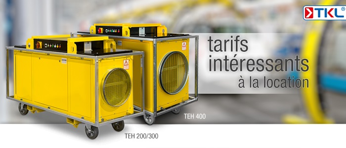 Ces chauffages sont disponibles à la location auprès de TKL France. Il est possible d’enlever les appareils sur place et de recevoir les appareils par transporteur. Pensez donc TKL si vous avez besoin d’accroître temporairement votre puissance de chauffe :