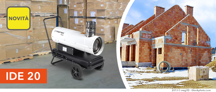 Prima che arrivi il freddo invernale, il generatore d’aria calda IDE 20 è subito pronto per la spedizione. Compatto, flessibile, affidabile e dal prezzo conveniente: IDE 20 è il generatore d’aria calda più piccolo della serie IDE di Trotec, la soluzione ideale che stavate aspettando per il riscaldamento economico di officine, magazzini, depositi o cantieri – con il generatore d’aria calda IDE 20 non resterete mai più al freddo!