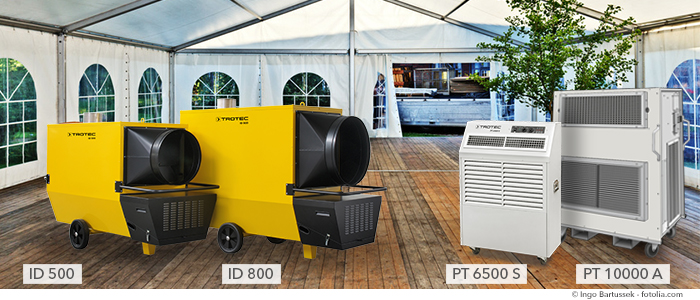Weil zu hohe genauso wie zu kühle Temperaturen im Festzelt oder in der Messehalle gründlich auf die Stimmung schlagen können, sollten Sie beizeiten vorsorgen. Haben Sie dabei etwa nur temporären Bedarf, so sind Sie bei TKL als Teil der Trotec-Unternehmensgruppe bestens aufgehoben. Nahezu alle Trotec-Produkte aus dem Bereich der Klimakonditionierung, Beheizung, Luftbehandlung und Ventilation können Sie bei TKL auch mieten.