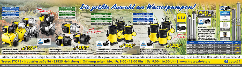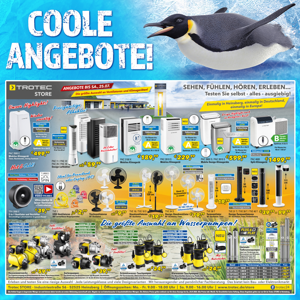 *Die Artikel liegen in begrenzter Menge vor und können daher bereits am ersten Aktionstag ausverkauft sein. Abgabe nur an Endverbraucher in haushaltsüblichen Mengen. Die Aktions-Preise gelten exklusiv nur für diesen Newsletter bis Sa., 25.07. und sind nur bei Trotec vor Ort in Heinsberg gültig.