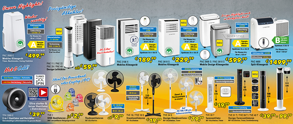 In unserem OUTLET bieten wir z. B. Ventilatoren, Klimageräte, Aircooler, Luftentfeuchter, Terrassen-Heizstrahler, Luftreiniger, Elektrowerkzeuge und vieles mehr schon ab 5,- € an! Natürlich wurden alle Versandretouren-Artikel und Vorführgeräte vorab von uns auf Herz und Nieren geprüft. So bekommen Sie einwandfreie Funktion zu stark vergünstigten Sonderpreisen.