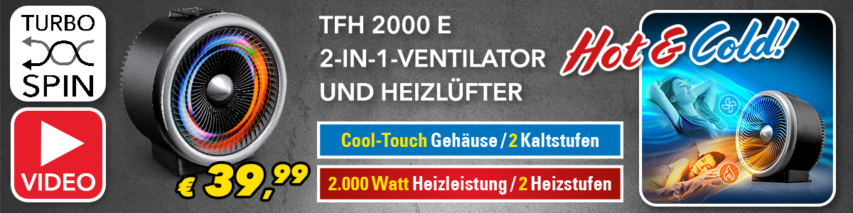 Der Turbo-Ventilator TFH 2000 E kann mit seinem Hochleistungsgebläse die Raumluft im Sommer effektiv umwälzen. Ideal z. B. auch als Ergänzung zur Klimaanlage. So kommt die kühle Luft in jeden Winkel. Im Winter sorgt das kompakte 2-in-1-Gerät darüber hinaus für muckelige Wohlfühlwärme. Jetzt im Trotec STORE zum Aktionspreis für nur 39,99 €. Weitere Infos gibt’s im folgenden Produktvideo: