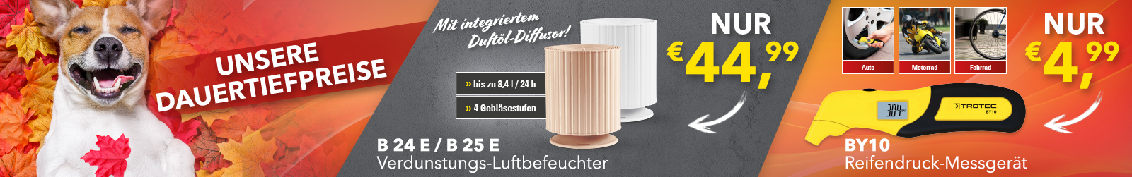 ACHTUNG! Verpassen Sie nicht unsere Dauertiefpreise, ob die Luftbefeuchter B 24 E / B 25 E oder das Reifendruck-Messgerät BY10 – passend zum Herbst!