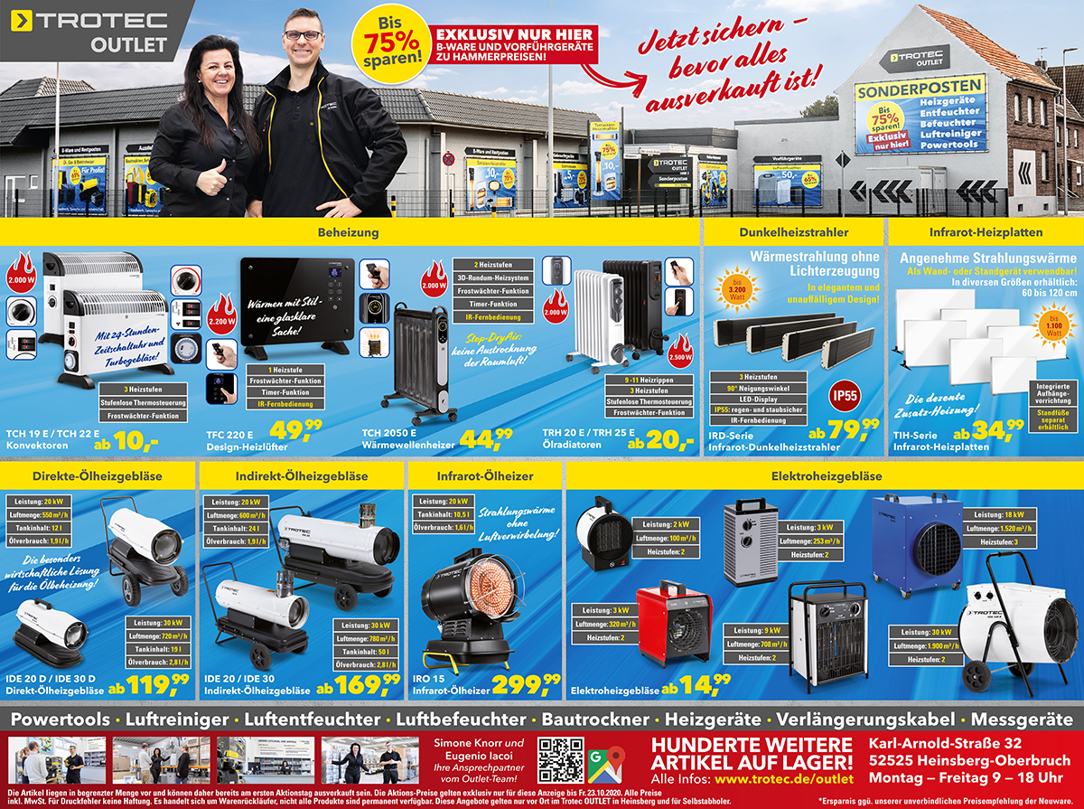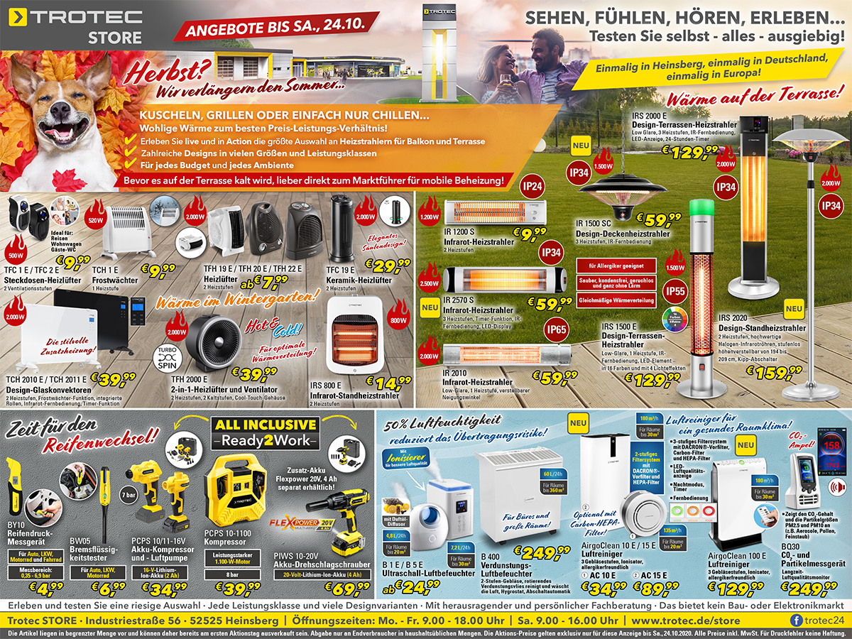 *Die Artikel liegen in begrenzter Menge vor und können daher bereits am ersten Aktionstag ausverkauft sein. Abgabe nur an Endverbraucher in haushaltsüblichen Mengen. Die Aktions-Preise gelten exklusiv nur für diesen Newsletter bis Sa., 24.10. und sind nur bei Trotec vor Ort in Heinsberg gültig.