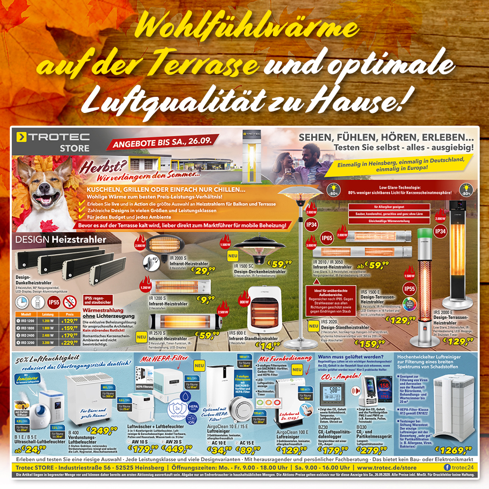*Die Artikel liegen in begrenzter Menge vor und können daher bereits am ersten Aktionstag ausverkauft sein. Abgabe nur an Endverbraucher in haushaltsüblichen Mengen. Die Aktions-­Preise gelten exklusiv nur für diesen Newsletter bis Sa., 26.09. und sind nur bei Trotec vor Ort in Heinsberg gültig.