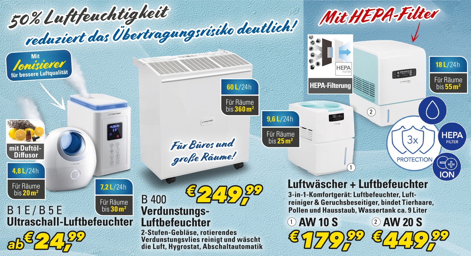 Achten Sie stets auf die richtige Luftfeuchtigkeit im Raum! Aerosole und die darin enthaltenen Viren sterben bei einer Luftfeuchtigkeit von ca. 50% schneller ab. Außerdem trocknen die Schleimhäute in den Atemwegen nicht so schnell aus und sind daher besser zur Immunabwehr gestärkt. Wir bieten im Trotec STORE eine große Auswahl an Luftbefeuchtern an. Ob Kaltverdunstung oder Vernebelung per Ultraschall, wir haben das passende Modell für Sie – selbst für große Räume oder Büros!