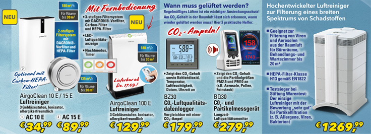 In der kalten Jahreszeit halten wir uns viel in Innenräumen auf. Luftreiniger befreien die Raumluft nicht nur von Staub, Fusseln und Tierhaaren, sondern darüber hinaus auch von Krankheitserregern, Schimmelsporen, Feinstaub, Milbenrückständen, Pollen und (per Ionisierung) von Gerüchen. Ob für Privat oder im Büro, mit HEPA-Filter oder ohne – wir beraten Sie gerne, welcher Luftreiniger für Ihren Einsatzzweck der effektivste ist.