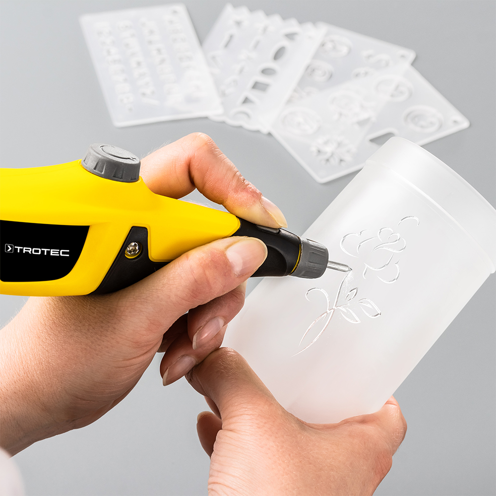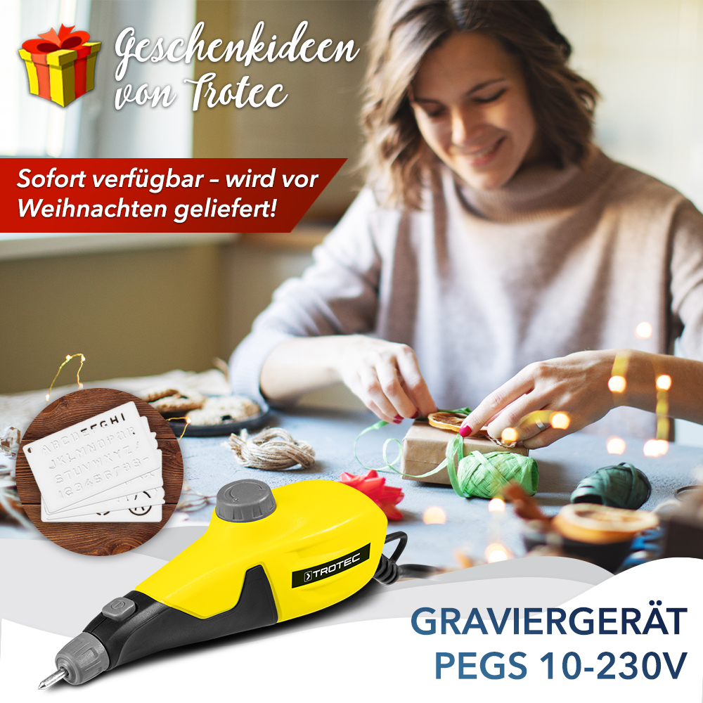 Lassen Sie Ihrer Kreativität freien Lauf und verwandeln Sie beliebige Gegenstände zu einzigartigen Unikaten. Mit dem handlichen Graviergerät PEGS 10-230V eröffnen sich Ihnen unendlich viele Möglichkeiten, um Alltags- und Haushaltsgegenstände, Schmuckstücke oder auch Geschenke aus den verschiedensten Materialien individuell zu gravieren und zu verschönern. Damit Sie sofort loslegen können, sind im Lieferumfang bereits 4 praktische Gravierschablonen mit Buchstaben, Zahlen sowie nützlichen als auch dekorativen Symbolen enthalten. Selbstverständlich eignet sich das Graviergerät ebenso, um Motive, Texte oder Zeichnungen freihändig auf das zu bearbeitende Objekt zu übertragen.