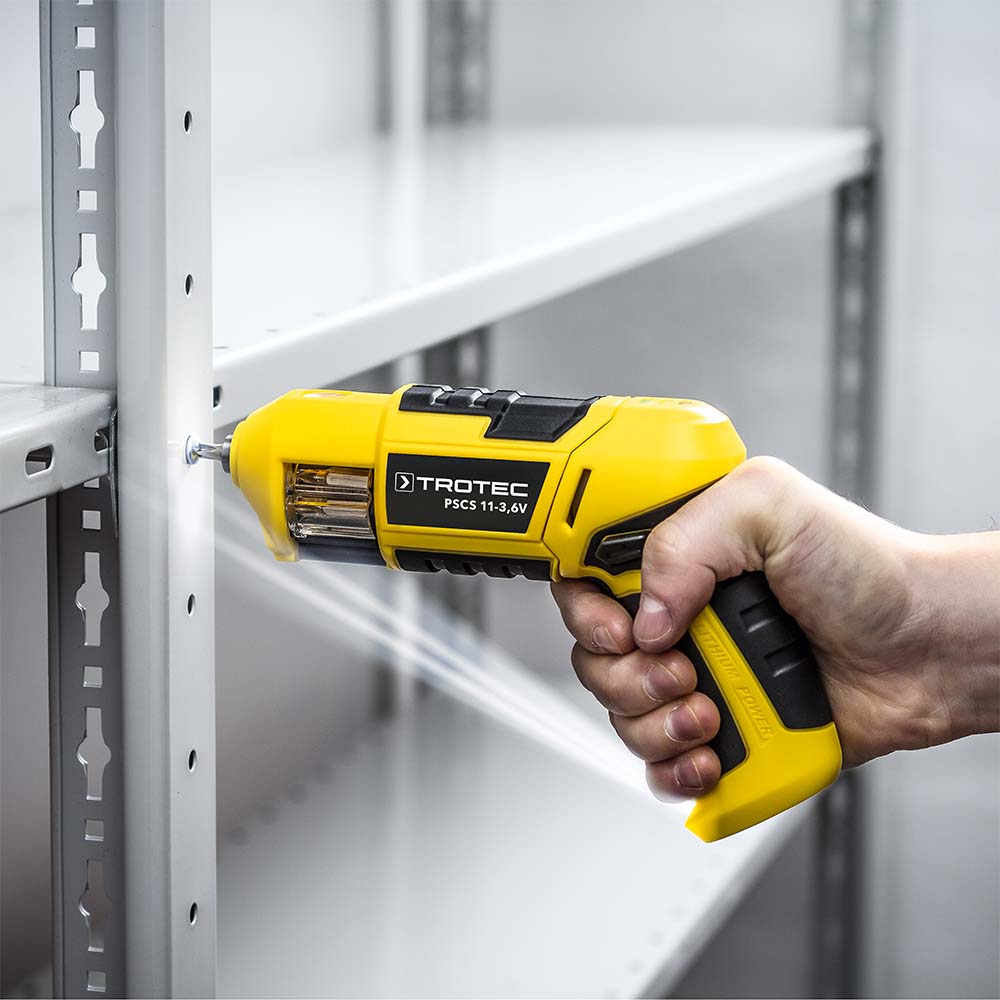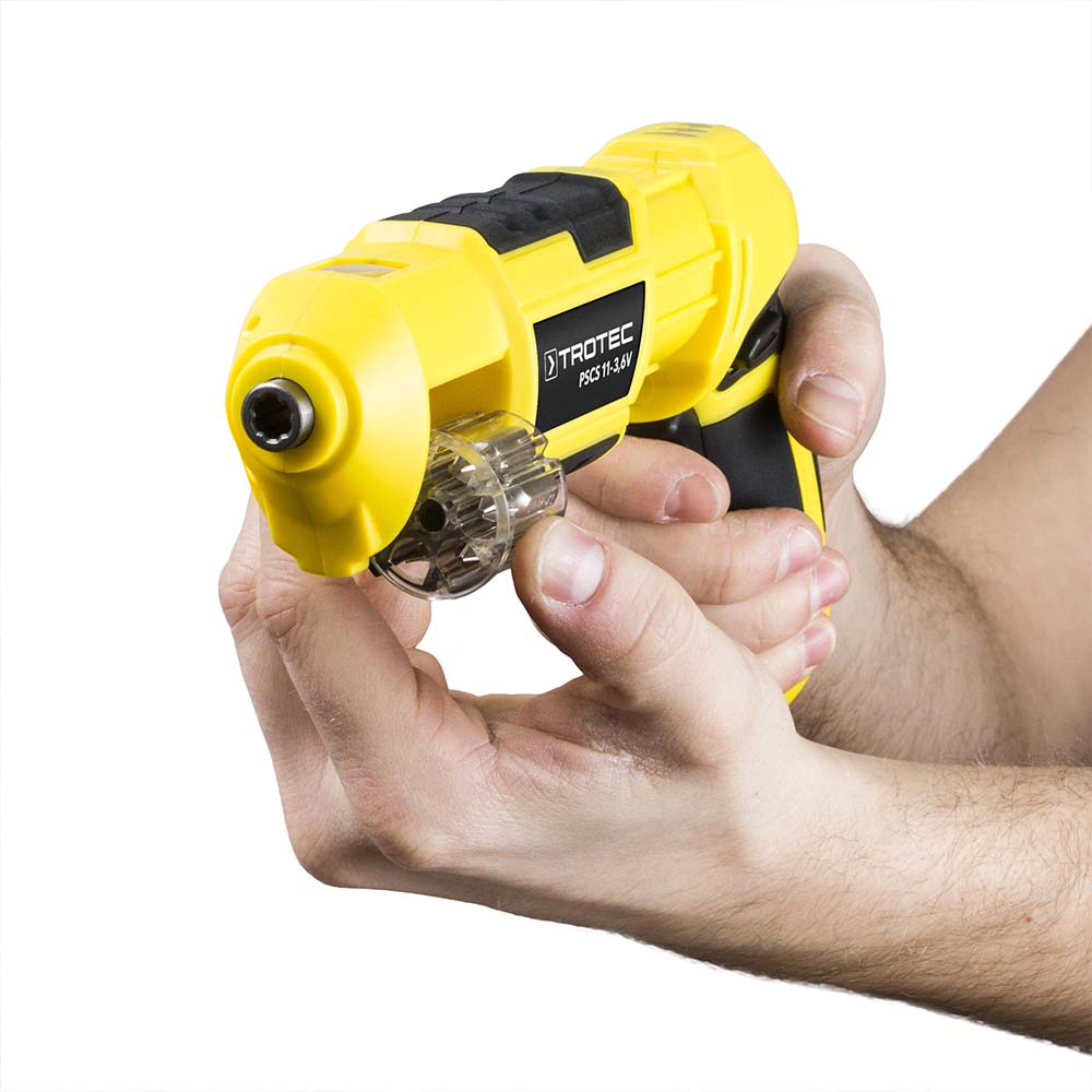 Wie bei einem Revolver kann mit nur einem Knopfdruck der Akkuschrauber-Schaft entriegelt und so das Magazin zum Dreh auf das gewählte Bit freigegeben werden. Ein praktisches Sichtfenster mit Lupe macht die Bit-Auswahl dabei spielend einfach. Somit ist ein einfacher Bit-Wechsel, beispielsweise auf einer Leiter, möglich ohne eine zusätzliche Bitbox mit zuführen.
