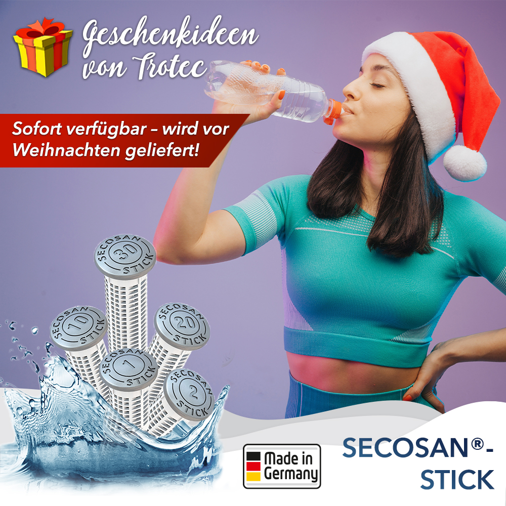 Ihr Körper braucht jeden Tag mindestens 1,5 Liter frisches Wasser. Nicht nur zu Hause, sondern auch, wenn Sie unterwegs sind, zum Beispiel beim Sport, im Büro oder beim Campingwochenende. Mit dem SecoSan-Stick sorgen Sie dafür , dass das Wasser in Ihrer Trinkflasche keimfrei ist und auch dauerhaft bleibt. Selbst in den Vorratsflaschen Ihres Wassersprudlers hält der Stick das Wasser nachweislich so rein, dass Sie sogar bedenkenlos Babynahrung damit zubereiten können. Worauf warten Sie also noch? Tun Sie sich und Ihrer Familie etwas Gutes und sorgen für pure Frische und einen fitten Körper.