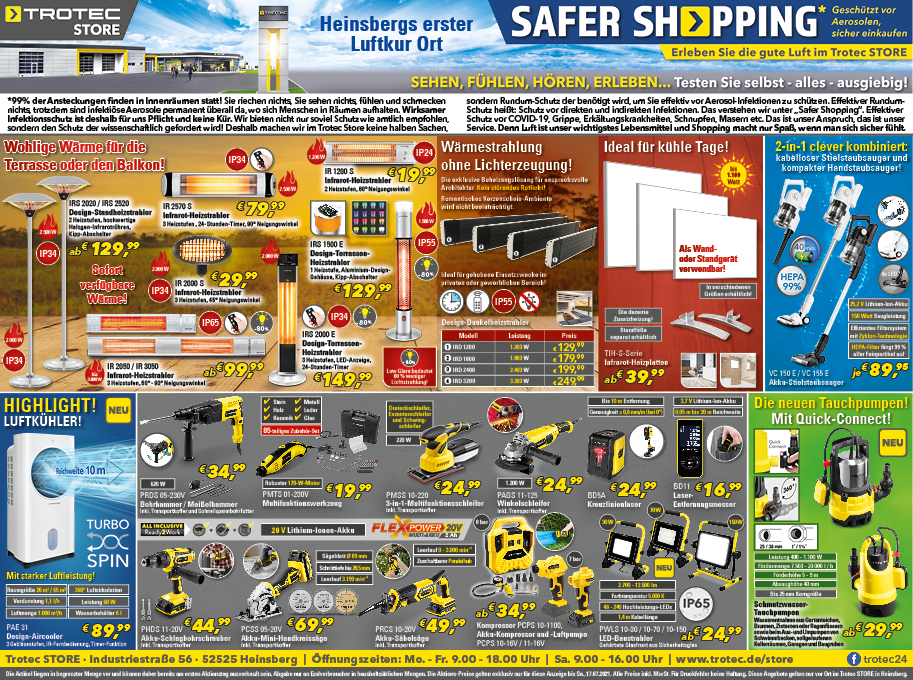 *Die Artikel liegen in begrenzter Menge vor und können daher bereits am ersten Aktionstag ausverkauft sein. Abgabe nur an Endverbraucher in haushaltsüblichen Mengen. Die Aktions-­Preise gelten exklusiv nur für diesen Newsletter bis Sa., 17.07. und sind nur bei Trotec vor Ort in Heinsberg gültig.