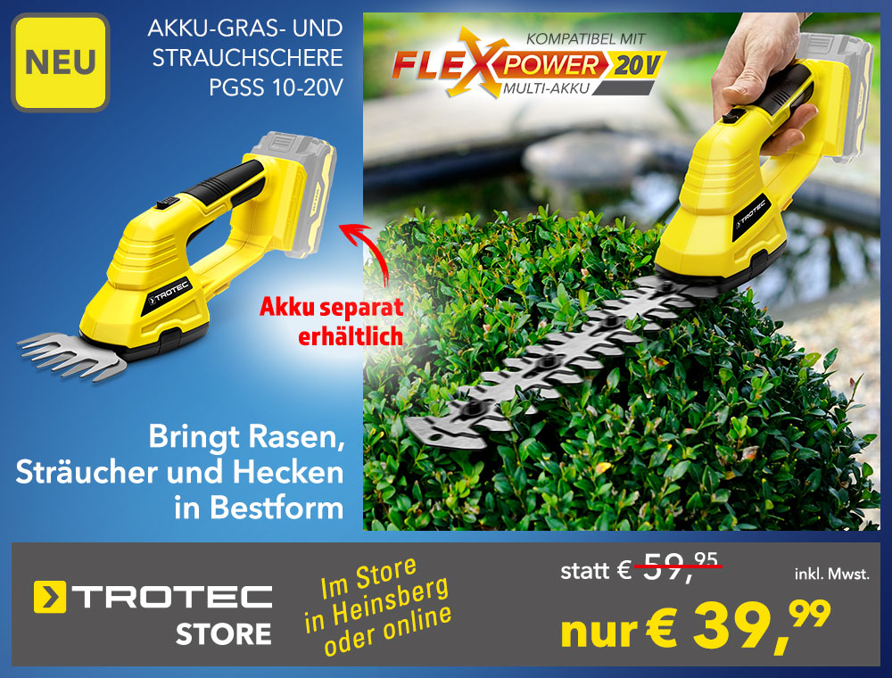 Für die Gartenarbeit haben wir das passende Werkzeug: Die bequem, sicher und leicht in der handliegende Gras- und Strauchschere ist flexibel einsetzbar dank FlexPower-Multi-Akku (nicht im Lieferumfang enthalten). Um Ihren individuellen Bedürfnissen und die Ihrer Gartenarbeit, wie z.B. an Gras, Sträuchern oder Hecken, gerecht zu werden, ist dieses praktische 2-in-1-Multitool mit einer Grasschere und einer Strauchschere ausgestattet und der Messerwechsel ist erstaunlich schnell und einfach, ohne Werkzeug, erledigt. Der passende 2,0 Ah oder 4,0 Ah FlexPower-Multi-Akku kann ganz einfach als Zubehör bestellt werden. Beide Akkus sind mit einer Vielzahl weiterer Trotec-Powertools kompatibel.