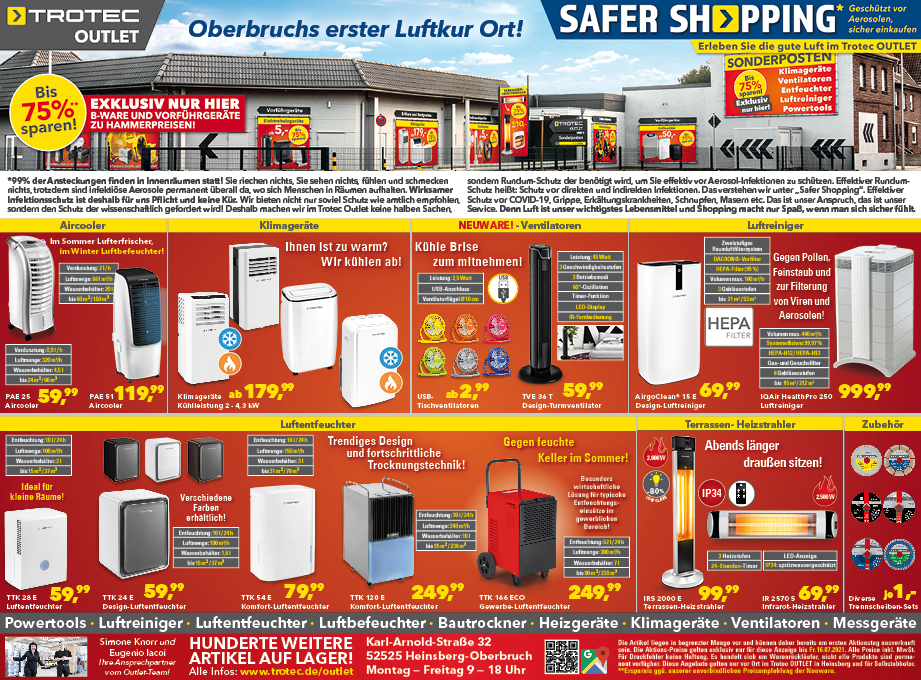 Wir bieten nicht nur soviel Schutz wie amtlich empfohlen, sondern den Schutz der wissenschaftlich gefordert wird! Deshalb machen wir im Trotec Store und Outlet keine halben Sachen, sondern Rundum-Schutz der benötigt wird, um Sie effektiv vor Aerosol-Infektionen zu schützen. Effektiver Rundum-Schutz heißt: Schutz vor direkten und indirekten Infektionen. Das verstehen wir unter ‚,Safer Shopping‘‘. Effektiver Schutz vor COVID-19, Grippe, Erkältungskrankheiten, Schnupfen, Masern etc. Das ist unser Anspruch, das ist unser Service. Denn Luft ist unser wichtigstes Lebensmittel und Shopping macht nur Spaß, wenn man sich sicher fühlt.