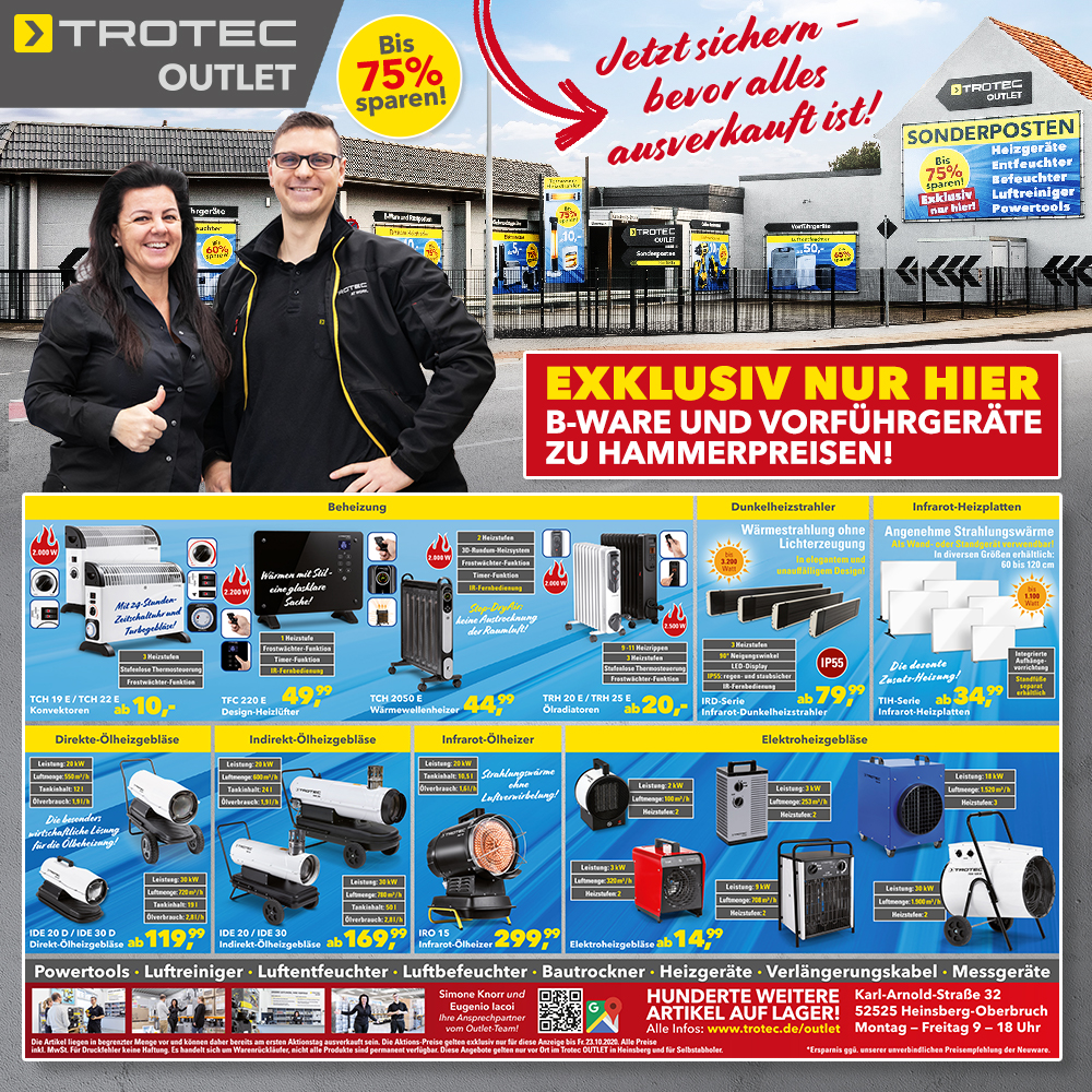*Die Artikel liegen in begrenzter Menge vor und können daher bereits am ersten Aktionstag ausverkauft sein. Abgabe nur an Endverbraucher in haushaltsüblichen Mengen. Die Aktions-Preise gelten exklusiv nur für diesen Newsletter bis Fr., 23.10. und sind nur bei Trotec vor Ort in Heinsberg gültig.