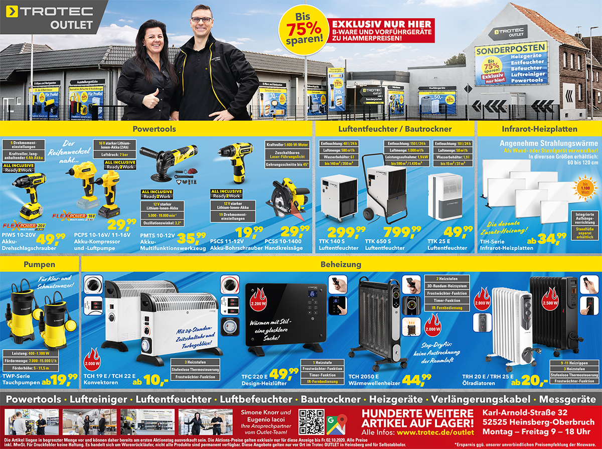 *Die Artikel liegen in begrenzter Menge vor und können daher bereits am ersten Aktionstag ausverkauft sein. Abgabe nur an Endverbraucher in haushaltsüblichen Mengen. Die Aktions-Preise gelten exklusiv nur für diesen Newsletter bis Fr., 02.10. und sind nur bei Trotec vor Ort in Heinsberg gültig.