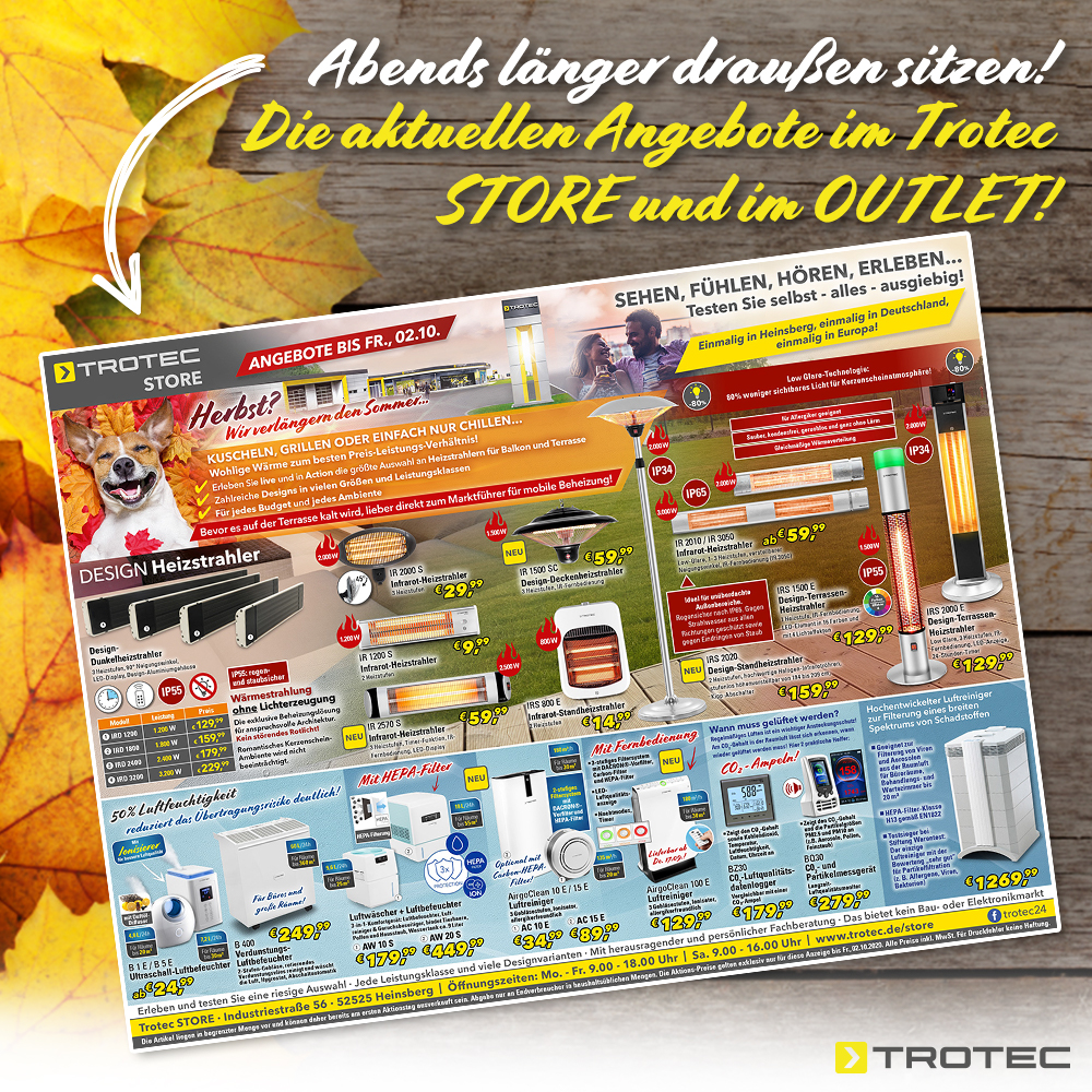 Für den anstehenden Herbst und die kühlere Jahreszeit haben wir bestimmt auch das richtige Angebot für Sie – schauen Sie einfach bei uns im Trotec STORE vorbei und schnappen Sie sich Infrarot-Heizstrahler zu unschlabaren Preisen um die Abende draußen auf der Terrasse oder dem Balkon zu verlängern. Auch Luftbefeuchter und Luftreiniger sind im Angebots-Programm vorhanden und hier ist bestimmt auch das richtige für Ihren Bedarf dabei – jetzt Angebote sichern!