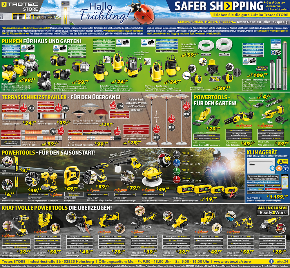 *Die Artikel liegen in begrenzter Menge vor und können daher bereits am ersten Aktionstag ausverkauft sein. Abgabe nur an Endverbraucher in haushaltsĂŒblichen Mengen. Die Aktions-ÂPreise gelten exklusiv nur fĂŒr diesen Newsletter bis Sa. 06.05. und sind nur bei Trotec vor Ort in Heinsberg gĂŒltig.