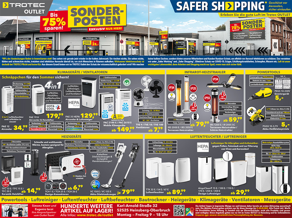 In unserem Trotec OUTLET bieten wir z. B. Ventilatoren, KlimagerĂ€te, Aircooler, Luftentfeuchter, Terrassen-Heizstrahler, Luftreiniger, Elektrowerkzeuge und vieles mehr schon ab 5,- ⏠an! NatĂŒrlich wurden alle Versandretouren-Artikel und VorfĂŒhrgerĂ€te vorab von uns auf Herz und Nieren geprĂŒft. So bekommen Sie einwandfreie Funktion zu stark vergĂŒnstigten Sonderpreisen.