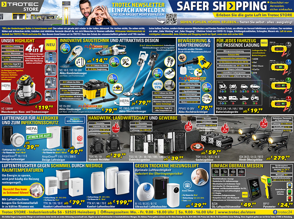 *Die Artikel liegen in begrenzter Menge vor und können daher bereits am ersten Aktionstag ausverkauft sein. Abgabe nur an Endverbraucher in haushaltsüblichen Mengen. Die Aktions-Preise gelten exklusiv nur für diesen Newsletter bis Sa. 28.01. und sind nur bei Trotec vor Ort in Heinsberg gültig.