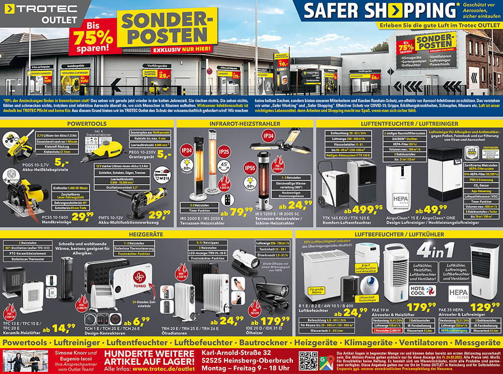 *Die Artikel liegen in begrenzter Menge vor und können daher bereits am ersten Aktionstag ausverkauft sein. Abgabe nur an Endverbraucher in haushaltsĂŒblichen Mengen. Die Aktions-ÂPreise gelten exklusiv nur fĂŒr diesen Newsletter bis Sa. 25.03. und sind nur bei Trotec vor Ort in Heinsberg gĂŒltig.