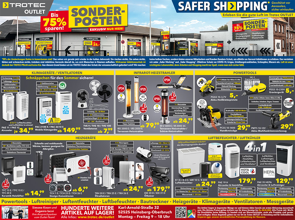 In unserem Trotec OUTLET bieten wir z. B. Ventilatoren, KlimagerĂ€te, Aircooler, Luftentfeuchter, Terrassen-Heizstrahler, Luftreiniger, Elektrowerkzeuge und vieles mehr schon ab 5,- ⏠an! NatĂŒrlich wurden alle Versandretouren-Artikel und VorfĂŒhrgerĂ€te vorab von uns auf Herz und Nieren geprĂŒft. So bekommen Sie einwandfreie Funktion zu stark vergĂŒnstigten Sonderpreisen.