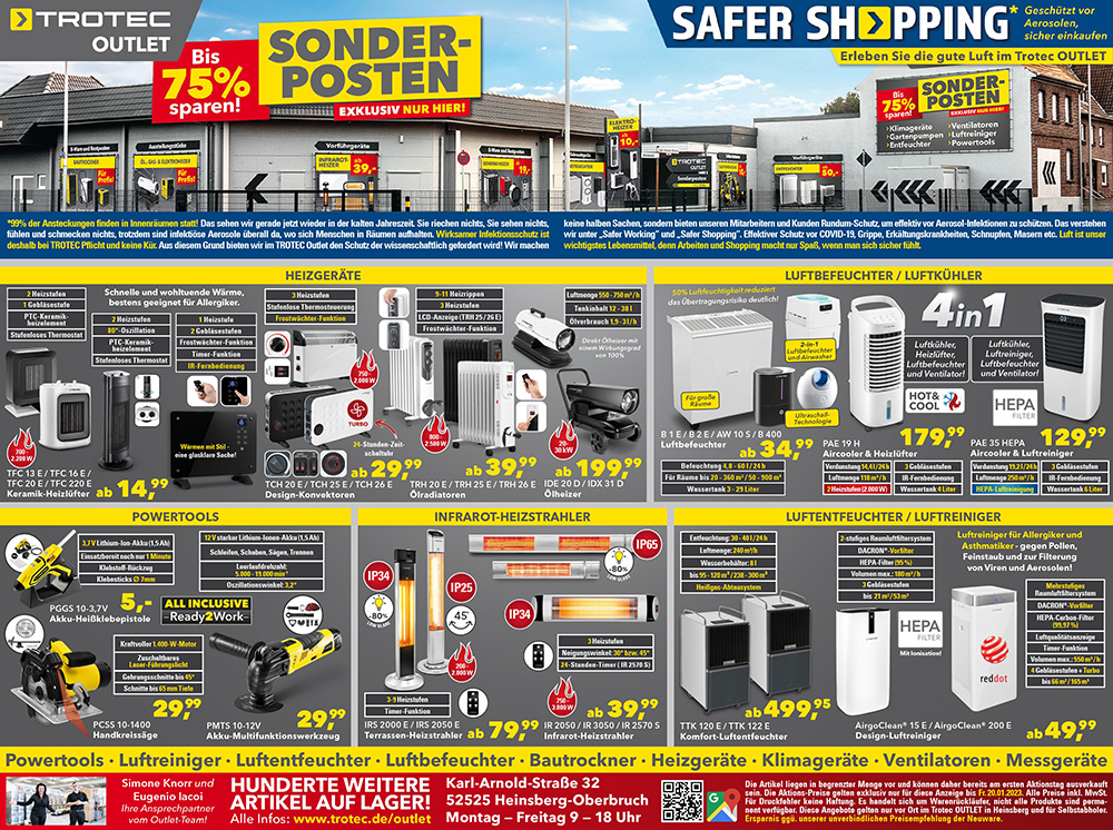 In unserem Trotec OUTLET bieten wir z. B. Ventilatoren, KlimagerĂ€te, Aircooler, Luftentfeuchter, Terrassen-Heizstrahler, Luftreiniger, Elektrowerkzeuge und vieles mehr schon ab 5,- ⏠an! NatĂŒrlich wurden alle Versandretouren-Artikel und VorfĂŒhrgerĂ€te vorab von uns auf Herz und Nieren geprĂŒft. So bekommen Sie einwandfreie Funktion zu stark vergĂŒnstigten Sonderpreisen.