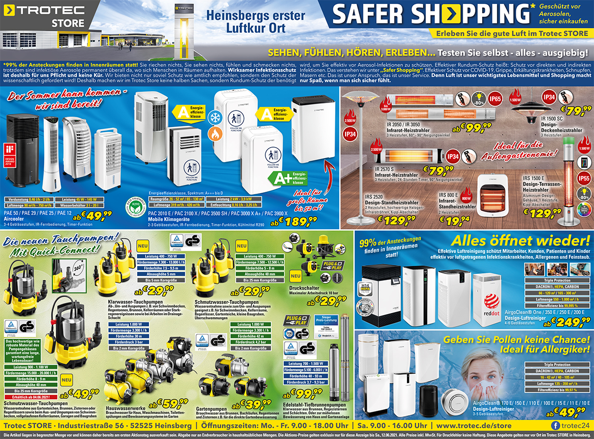 *Die Artikel liegen in begrenzter Menge vor und können daher bereits am ersten Aktionstag ausverkauft sein. Abgabe nur an Endverbraucher in haushaltsüblichen Mengen. Die Aktions-Preise gelten exklusiv nur für diesen Newsletter bis Sa., 12.06. und sind nur bei Trotec vor Ort in Heinsberg gültig.