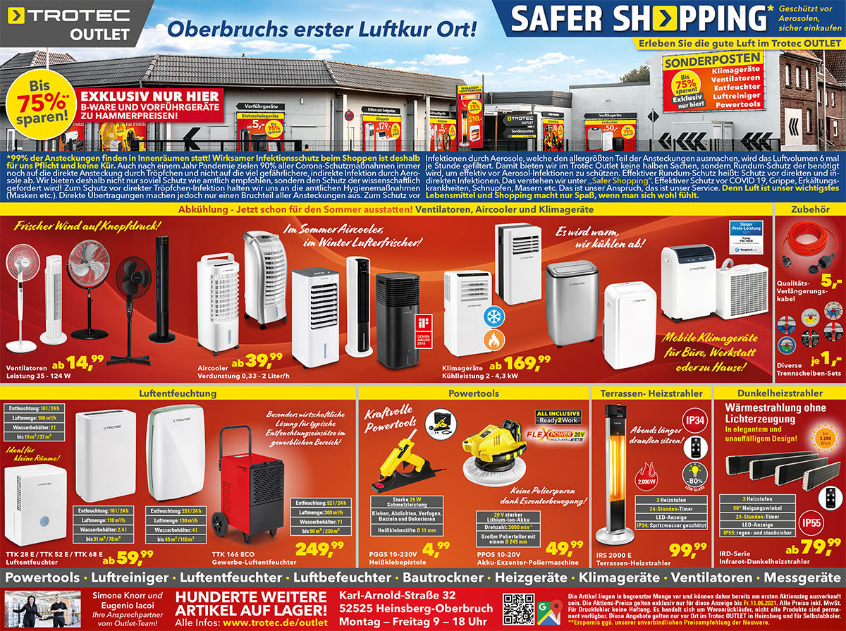 In unserem OUTLET bieten wir z. B. Ventilatoren, Klimageräte, Aircooler, Luftentfeuchter, Terrassen-Heizstrahler, Luftreiniger, Elektrowerkzeuge und vieles mehr schon ab 5,- € an! Natürlich wurden alle Versandretouren-Artikel und Vorführgeräte vorab von uns auf Herz und Nieren geprüft. So bekommen Sie einwandfreie Funktion zu stark vergünstigten Sonderpreisen.