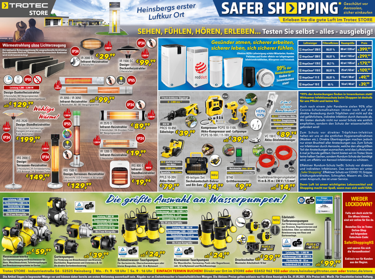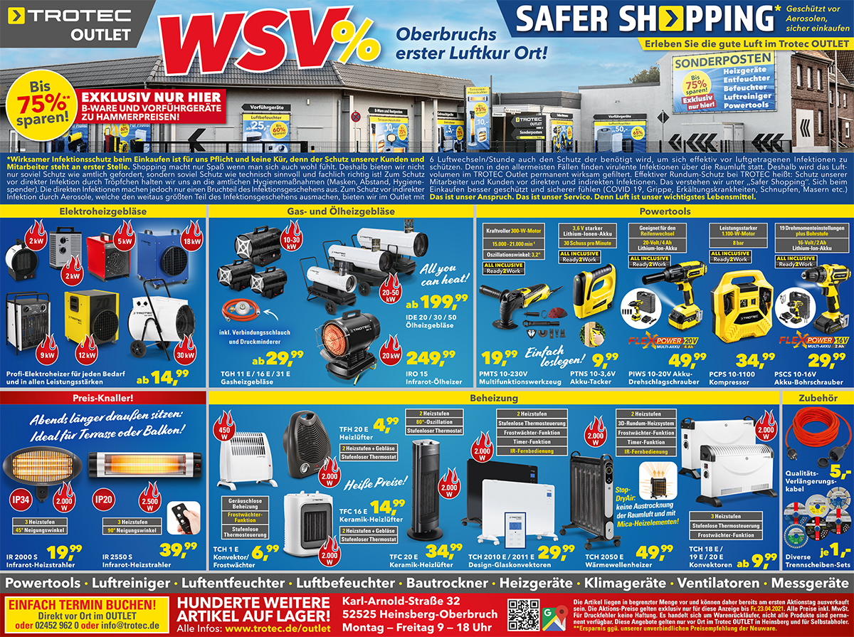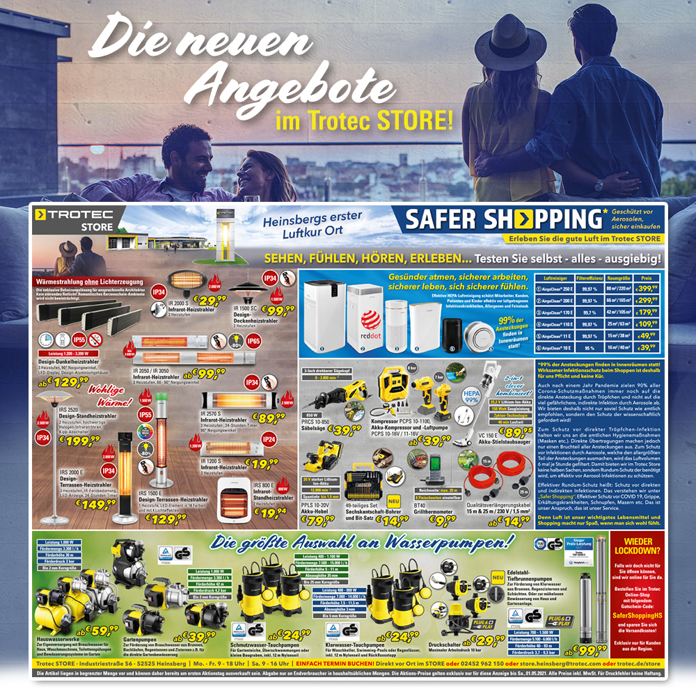 *Die Artikel liegen in begrenzter Menge vor und können daher bereits am ersten Aktionstag ausverkauft sein. Abgabe nur an Endverbraucher in haushaltsüblichen Mengen. Die Aktions-Preise gelten exklusiv nur für diesen Newsletter bis Sa., 01.05. und sind nur bei Trotec vor Ort in Heinsberg gültig.