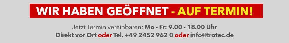 *Die Artikel liegen in begrenzter Menge vor und können daher bereits am ersten Aktionstag ausverkauft sein. Abgabe nur an Endverbraucher in haushaltsüblichen Mengen. Die Aktions-Preise gelten exklusiv nur für diesen Newsletter bis Fr., 23.04. und sind nur bei Trotec vor Ort in Heinsberg gültig.