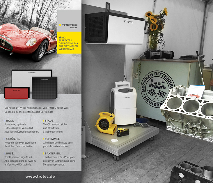 Um diesen Gefahren zu begegnen, hat Trotec den DH-VPR+ Klimamanager entwickelt, einen mit der ThinC! Technologie ausgestatteten Luftentfeuchter, zum Schutz vor Korrosion, Schimmel, Porosität und Zersetzung. Die Garagenluft wird konstant auf Optimal-Niveau gehalten, Rost und Schimmelbildung haben keine Chance. Gleichzeitig reduziert der DH-VPR+ Klimamanager zuverlässig die Staub- und Rußbildung in der Garage und beugt unschönen Ablagerungen auf dem Schmuckstück vor. Obendrauf kommt noch der hochwertige Industrieionisator, zur effektiven Beseitigung von störenden Benzin- und Modergerüchen.