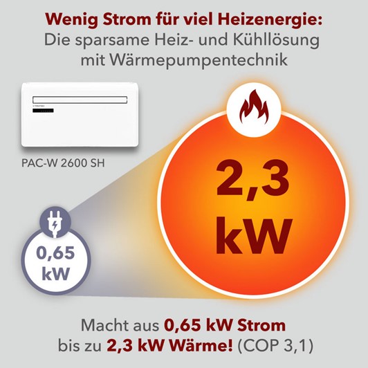 Die Klimageräte PAC-W 2600 SH und PAC-W 2650 SH generieren aus 1 KWh Strom mehr als 3 KWh Wärme. Damit liegt der Energieeinsatz für die erzeugte Wärme deutlich unter den Kosten von Heizungsanlagen mit fossilen Energieträgern wie Gas, Öl oder Pellets.