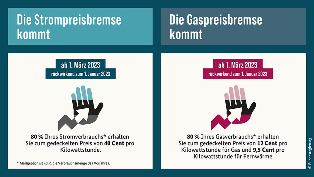 Um die Bürgerinnen und Bürger im neuen Jahr bei den stark gestiegenen Kosten für Strom und Gas zu entlasten, tritt ab dem 01. März (rückwirkend zum 01. Januar 2023) die Strom- und Gaspreisbremse für Privathaushalte in Kraft. Damit darf die Kilowattstunde Strom für 80 Prozent des Jahresverbrauches maximal 40 Cent kosten. Lediglich die restlichen 20 Prozent kann der Energieversorger zum aktuellen Stromtarif abrechnen. Beim Gaspreisdeckel gilt für 80 Prozent des Vorjahresverbrauchs ein gedeckelter Preis von 12 Cent je Kilowattstunde, die verbleibenden 20 Prozent werden voll berechnet.