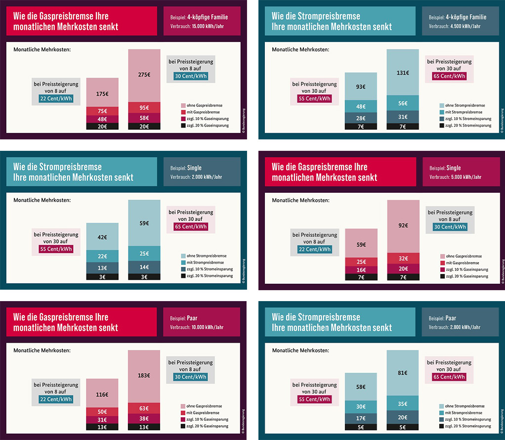 Wie hoch die voraussichtlichen Einsparungen bei den Mehrkosten für Strom und Gas mit den gedeckelten Preisen ausfallen, zeigen die nachfolgenden Beispiele.