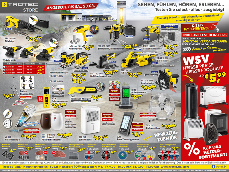Schrauben, Hobeln, Schleifen, Sägen, Bohren… unsere Powertools unterstützen Sie bei Ihren kreativen Projekten und sind zu attraktiven Preisen in unserer aktuellen Werbung! Es gibt natürlich noch weitere unschlagbare Schnäppchen in unserem Trotec STORE in Heinsberg.