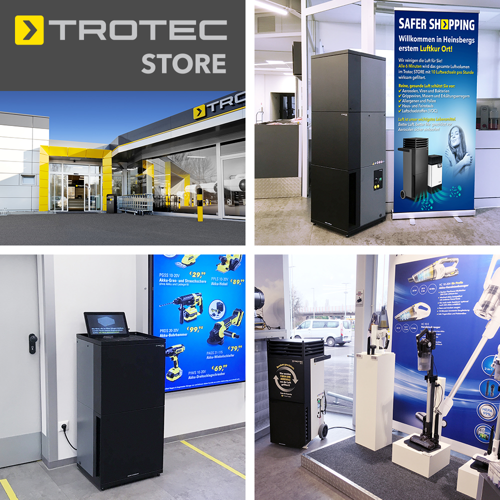 Ein Besuch im Trotec STORE lohnt sich immer. Ob Powertools, Luftentfeuchter, Luftbefeuchter, Klimageräte, Ventilatoren, Gartenpumpen, Terrassen-Heizstrahler, Luftreiniger und vieles mehr – im Trotec STORE können Sie sich von der Qualität und den Eigenschaften sämtlicher Trotec-Produkte live überzeugen. Selbstverständlich beraten wir Sie ausführlich zu jedem Produkt und passgenau für Ihren Anwendungsfall.