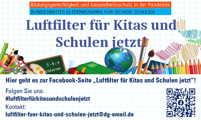 Mehr Bildungsgerechtigkeit und Gesundheitsschutz in der Pandemie fordert auch das „Bundesweite Elternbündnis für sichere Schulen“. Eine zentrale Forderung ist auch hier der präventive Einsatz von Schutzwänden und mobilen Raumluftreinigern, damit Kita- und Schulbesuche wieder sicher stattfinden können.