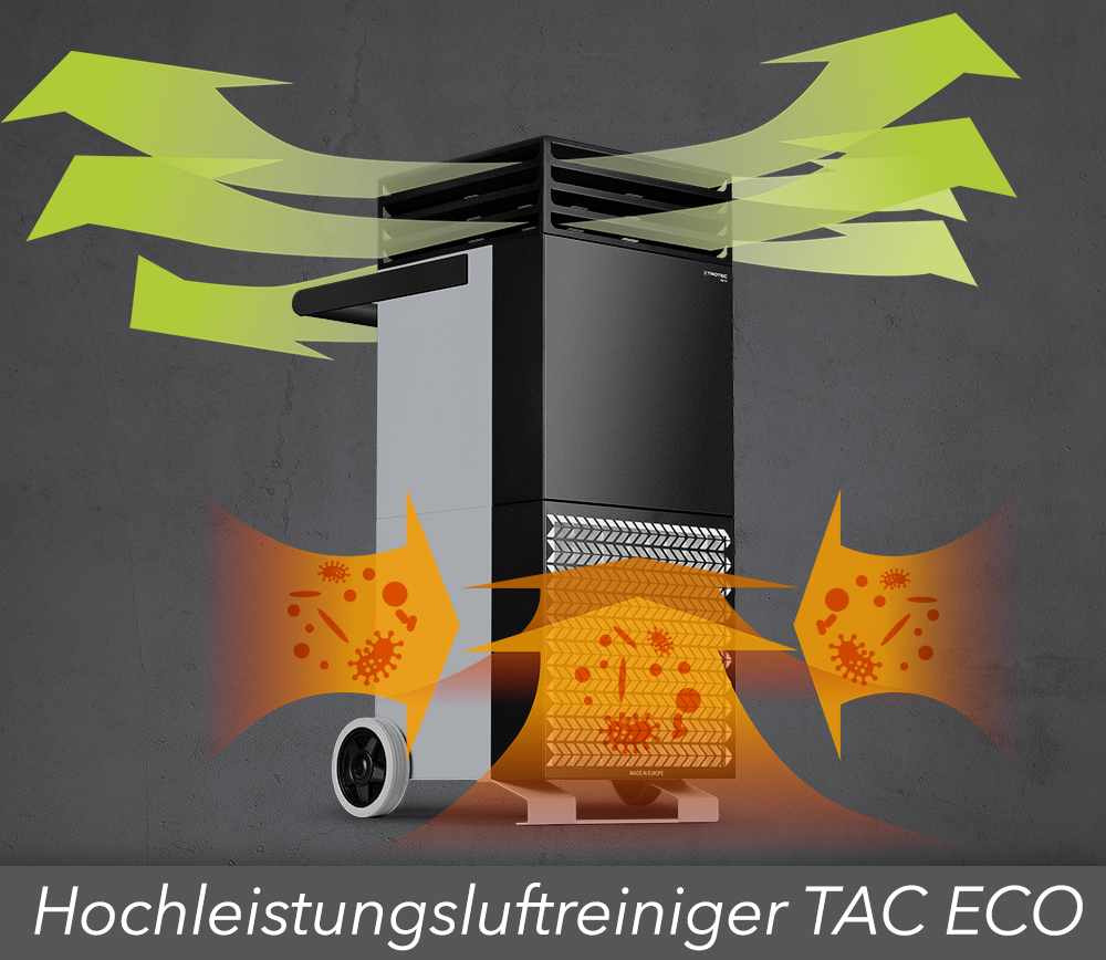 Sogar noch übertroffen werden diese von Prof Kähler definierten Kriterien vom mobilen Hochleistungsluftreiniger TAC V+. Entwickelt und gefertigt wird das Gerät in Deutschland (Heinsberg) – ausgeliefert wird es in die ganze Welt. Eine stets aktuelle Übersicht auf der Unternehmensseite, welche Restaurants, Behörden, Schulen oder medizinischen Einrichtungen den TAC V+ Hochleistungsluftreiniger bereits einsetzen, unterstreicht die erprobte Wirksamkeit der TAC V+ Luftreinigung.