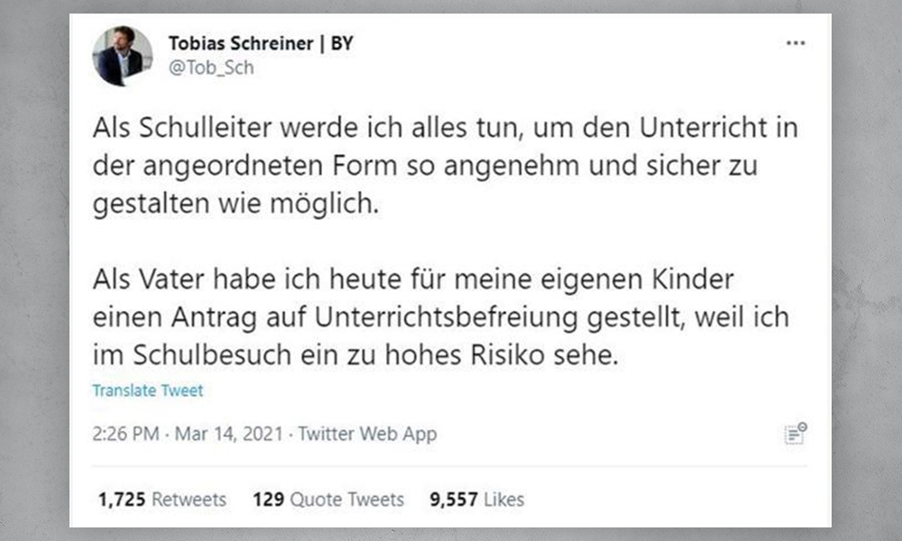 „Als Schulleiter werde ich alles tun, um den Unterricht in der angeordneten Form so angenehm und sicher zu gestalten wie möglich“, schreibt Tobias Schreiner in seinem Tweet vom 14. März 2021 und ergänzt: „Als Vater habe ich heute für meine eigenen Kinder einen Antrag auf Unterrichtsbefreiung gestellt, weil ich im Schulbesuch ein zu hohes Risiko sehe.“