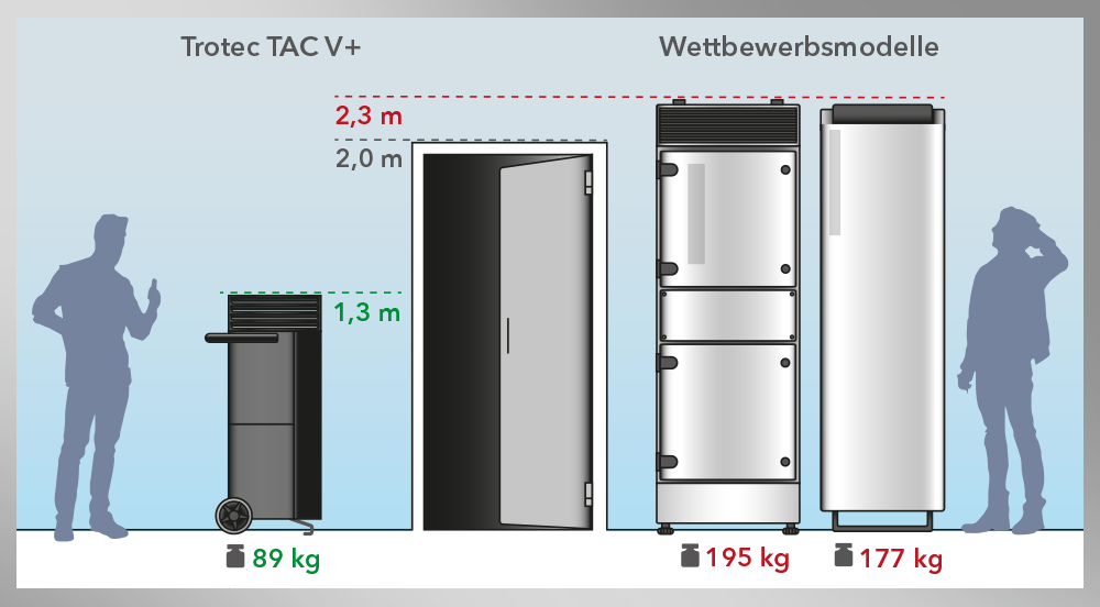 Um den Luftreiniger möglichst flexibel und bedarfsgerecht in verschiedenen Räumen einzusetzen, verfügt der TAC V+ über Leichtlaufrollen und einen Schubgriff. So lässt sich das Gerät je nach Bedarf und Auslastung in verschiedenen Räumen nutzen! Zudem passt der TAC V+ aufgrund seiner vergleichsweise geringen Höhe durch jede Tür und in jeden Aufzug. Ein unbezahlbarer Luxus in der Corona-Pandemie, von der aktuell noch niemand weiß, was uns die Zukunft bringt.
