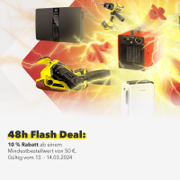 Startschuss für die Mega-Aktion! Heute beginnt unser exklusiver 48-h Flash Deal, und wir könnten nicht aufgeregter sein! Nur für kurze Zeit bieten wir Ihnen einen sensationellen Rabatt von 10 % auf alle Bestellungen über 50 € an. Aber das ist längst nicht alles, was wir für Sie bereithalten. Entdecken Sie unser vielfältiges Sortiment: Von effizienten Luftentfeuchtern über gemütliche Terrassenstrahler bis hin zu unverzichtbaren Werkzeugen für Haus und Garten, Wasserpumpen und vieles mehr – bei uns finden Sie alles, was Ihr Herz begehrt, zu Preisen, die Sie zum Staunen bringen werden.