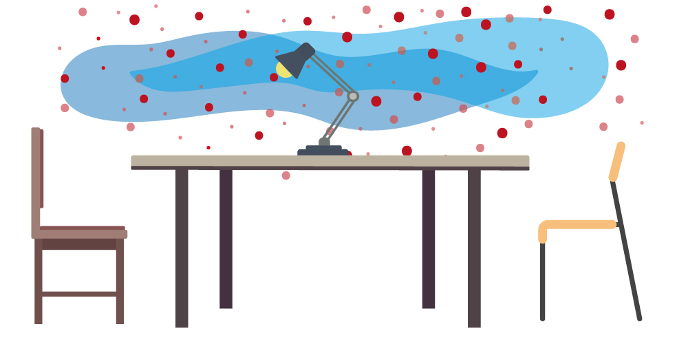 Je mehr Beschäftigte in einem Raum zusammenarbeiten und je kleiner der Raum ist, desto höher ist das indirekte Infektionsrisiko durch Schwebstoffpartikel in der Luft. Entscheidend für die Ansteckungsgefahr in Innenräumen ist die Dauer, wie lange infektiöse Aerosolpartikel in der Raumluft verbleiben. Ein Aerosol ist ein gasförmiges Gemisch, das in der Lunge erzeugt wird und bei erkrankten Menschen Viren enthält. Die winzig kleinen Aerosolpartikel werden vorwiegend beim Atmen und Sprechen in den Raum freigesetzt. Während größere Tröpfchen aufgrund ihres Gewichts bereits nach ca. 1,5 Metern zu Boden sinken (daher die Abstandsregel von 1,5 m), schweben die leichten und unsichtbaren Aerosolteilchen aufgrund ihrer geringen Größe (ca. 0,1-0,3 µm) bis zu mehrere Stunden in der Raumluft, verteilen sich mitunter über Lüftungsanlagen und werden selbst viele Meter entfernt unbemerkt eingeatmet. Im Gegensatz zur Luft im Freien, wo Aerosolgemische durch die Luftbewegung mit sauberer Frischluft verdünnt und verweht werden, bleibt die Aerosolkonzentration in geschlossenen Räumen fortwährend hoch und steigt mit jedem Ausatmen an. Je länger und je mehr Aerosolteilchen in der Luft umherschweben, desto schneller gelangen diese über die Atemwege in den Körper und führen zu einer Infektion der Lunge.