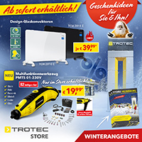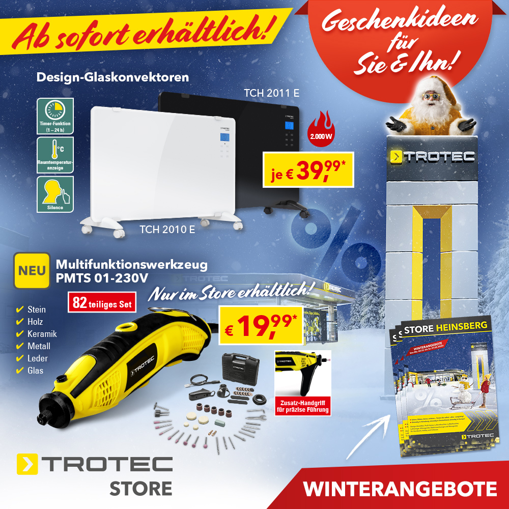 *Die Artikel liegen in begrenzter Menge vor und können daher bereits am ersten Aktionstag ausverkauft sein. Abgabe nur an Endverbraucher in haushaltsüblichen Mengen. Die Aktions-Preise sind exklusiv nur bis Sa., 01.02.2020 bei Trotec vor Ort in Heinsberg gültig. Alle Preise inkl. MwSt. Für Schreibfehler keine Haftung.
