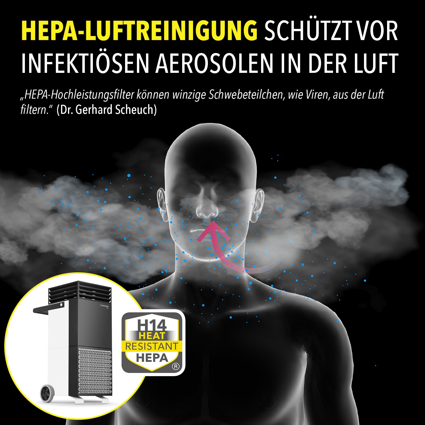 Virologen und Experten in der Erforschung sogenannter Aerosole sind sich einig: Das Coronavirus wird vor allem über die Raumluft übertragen. Ursächlich dafür sind winzig kleine Aerosolteilchen, die Infizierte beim Atmen und Sprechen in die Raumluft abgegeben. Diese für das bloße Auge nicht sichtbaren Teilchen schweben bis zu mehrere Stunden infektiös in der Luft und werden von den anwensenden Personen im Raum eingeatmet. Einen wirksamen Schutz vor diesen Krankmachern bieten Hochfrequenz-Luftreiniger wie der TAC V+ von Trotec, die mit einem speziellen HEPA-Filter der Filterklasse H14 ausgestattet sind. Infektiöse Aerosole werden aus der Luft gefiltert – bevor sie über die Atemwege in den Körper gelangen.
