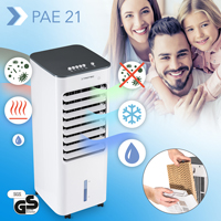 Mit einer Verdunstungsleistung von 0,8 Litern pro Stunde und seinem 5,6 Liter-Wassertank gibt der PAE 21 bis zu 7 Stunden lang kühlende Luft ab, ohne dass Wasser nachgefüllt werden müsste. Wenn Sie die beiden im Lieferumfang enthaltenen Kühl-Akkus in den Wasserbehälter geben, kann die Kühlleistung des PAE 21 noch gesteigert werden. Für eine gleichmäßige Luftverteilung lässt sich die automatische Swing-Funktion aktivieren, bei der die innen liegenden senkrechten Lamellen dauerhaft von links nach rechts hin und her schwenken. Die äußeren waagrechten Lamellen lassen sich hingegen stufenlos per Hand justieren und führen so den Luftstrom auf Wunsch nach vorne, oben oder unten.