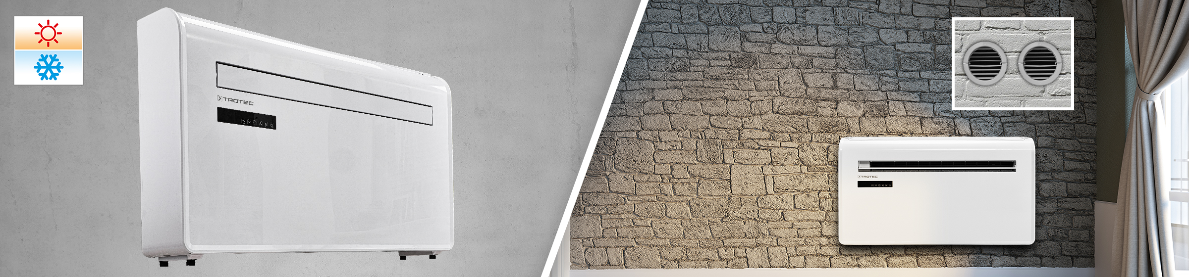 Klimaanlagen sind im heißen Sommer ein echter Segen. Split-Geräte versprechen auch bei Rekordtemperaturen eine schnelle Abkühlung. Allerdings erfordern diese Anlagen eine unschöne Außeneinheit, die zudem mit erheblichem Aufwand montiert werden muss. Schöner, einfacher und dadurch erheblich günstiger kühlen Sie im nächsten Sommer mit der PAC-W 2600 SH Klimaanlage ohne Außeneinheit. Die Abkühlung erfolgt durch nur zwei Lüftungsschlitze in der Außenwand.